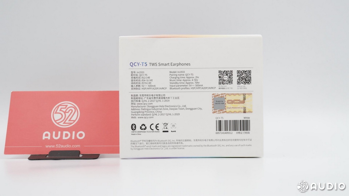 包裝盒背面是一組中英文對(duì)照的產(chǎn)品信息,主要內(nèi)容有:QCY T5 TWS藍(lán)牙耳機(jī),型號(hào)In1933,音樂播放時(shí)間約4-5小時(shí),輸入?yún)?shù)5V?500mA,支持協(xié)議:HSP/HFP/A2DP/AVRCP,制造商:東莞市和樂電子有限公司。此外還有一些認(rèn)證信息和防偽查詢信息等。