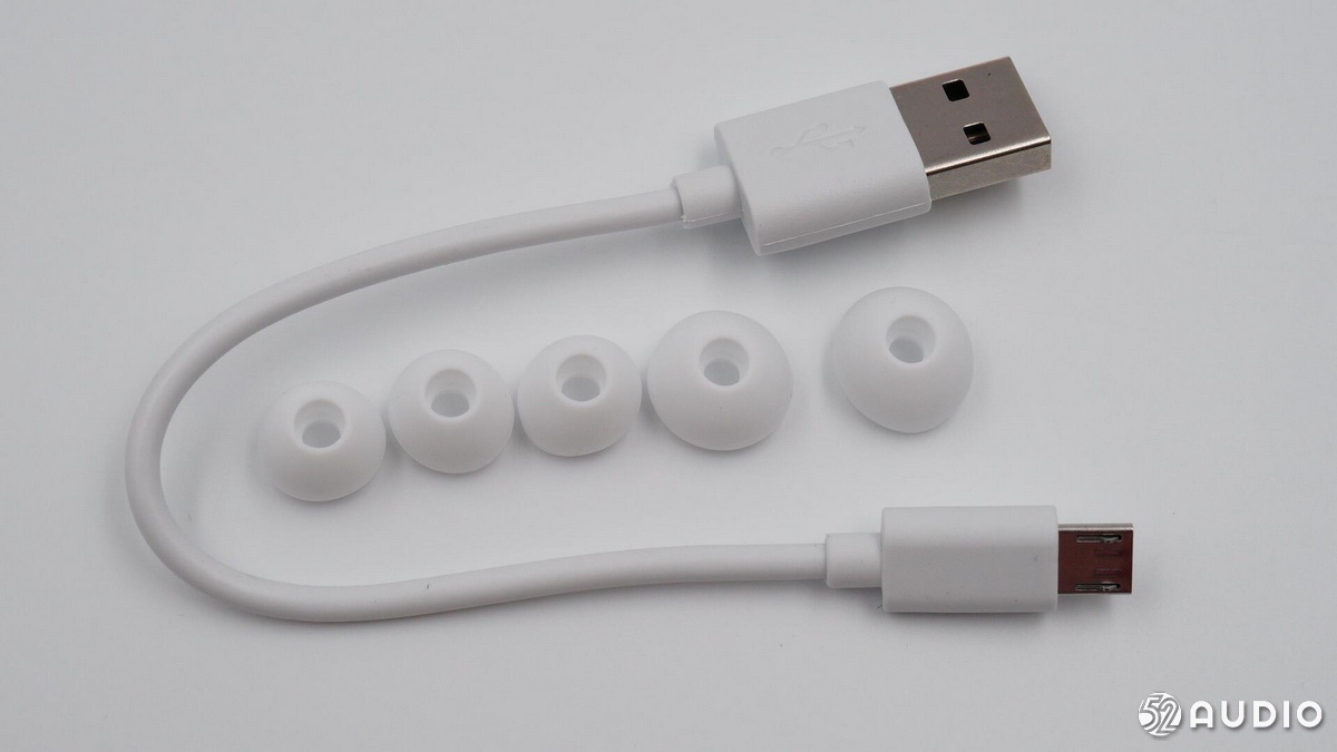 充電線為USB-A to Micro-USB 接口,附贈(zèng)了兩對(duì)不同尺寸的硅膠耳塞(多給了一個(gè))。