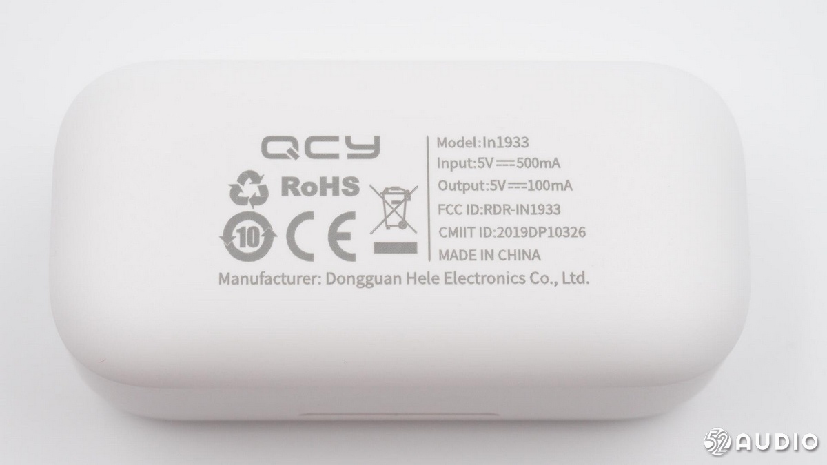 充電盒底部信息,型號(hào):In1933,輸入:5V?500mA,輸出:5V?100mA。