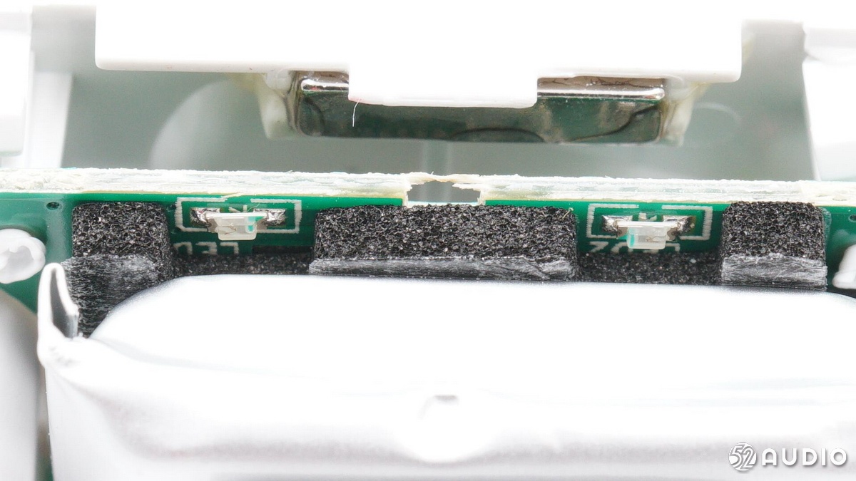 充電座艙內(nèi)側(cè)的三塊磁鐵,兩塊小的用于固定耳機(jī),一塊大的用于吸附充電盒蓋。