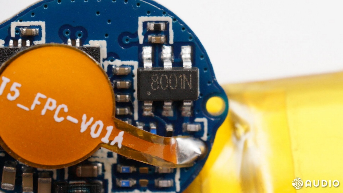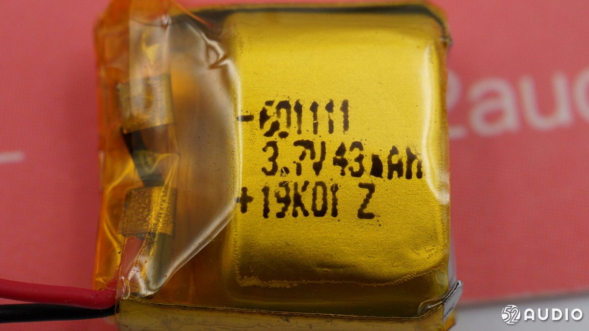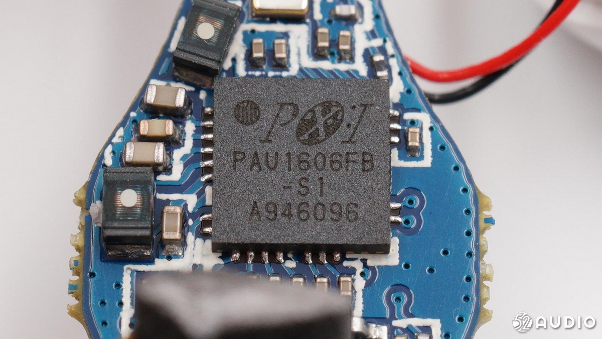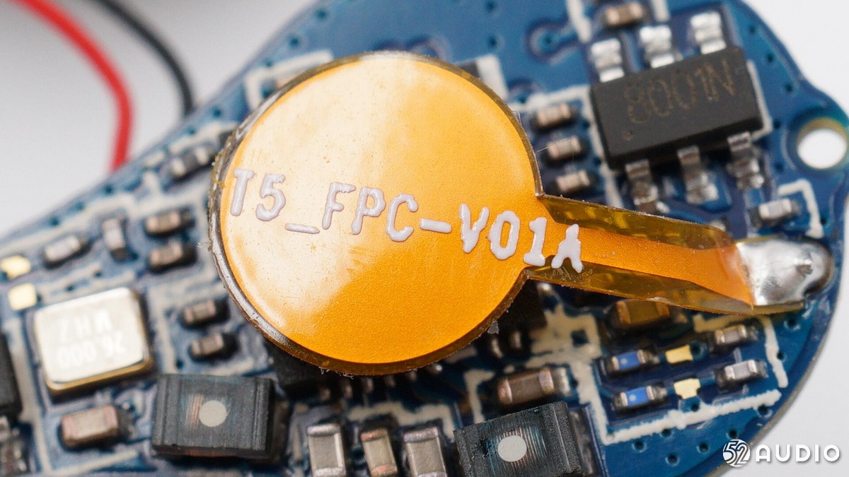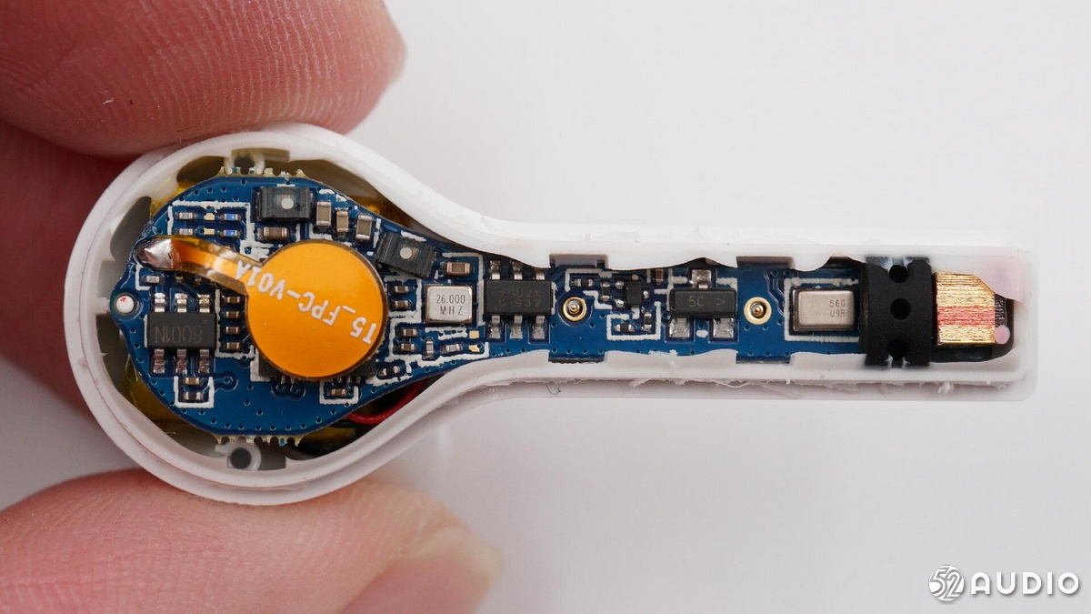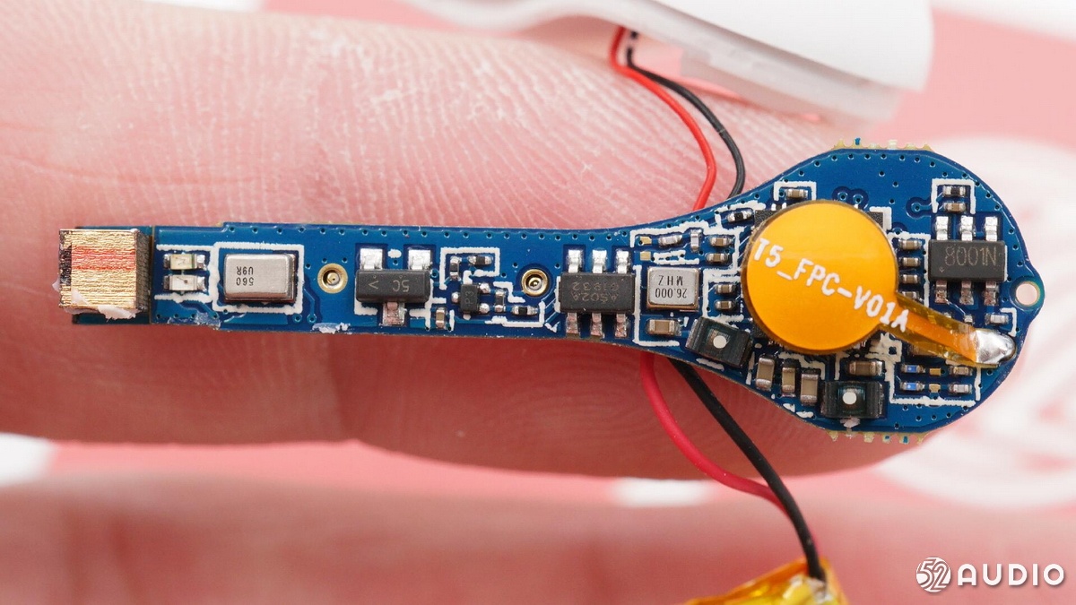 耳機(jī)部分,QCY T5 與T4一樣采用了原相 PAU1606FB-S1藍(lán)牙音頻SoC,支持藍(lán)牙5.0,其GeendRadio?立體聲技術(shù),具有左右耳快速切換、低延遲的特點(diǎn),被很多“游戲TWS”耳機(jī)采用。并且該芯片內(nèi)置鋰離子電池充電器,確保耳機(jī)電池的充電安全;耳機(jī)內(nèi)的軟包電池容量為43mAh,與T4一樣。耳機(jī)采用疊層貼片藍(lán)牙天線收發(fā)藍(lán)牙信號(hào)。