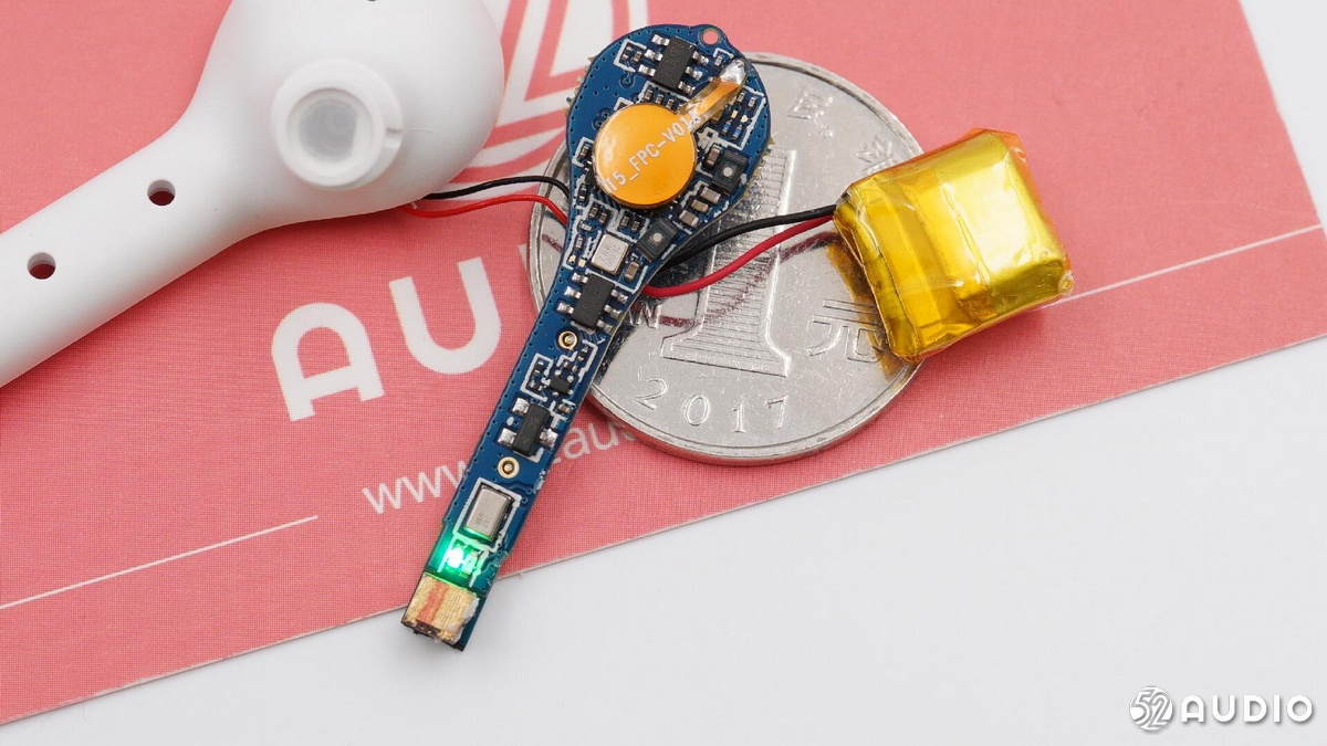 耳機(jī)主板和軟包電池與一元硬幣的尺寸對(duì)比。