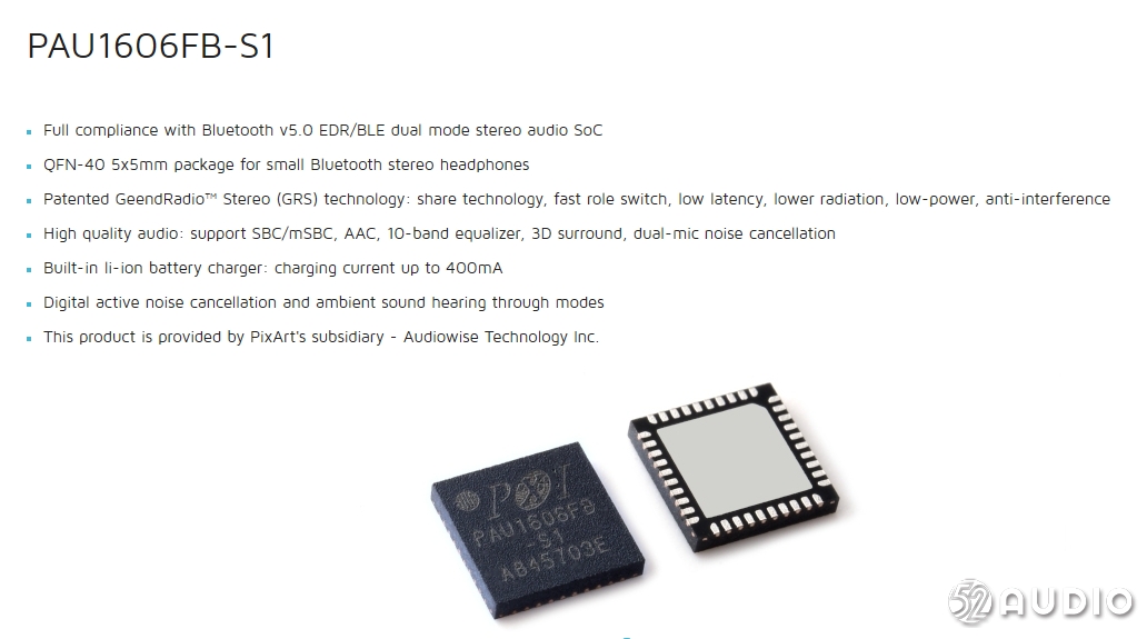 原相 PAU1606FB-S1支持SBC / mSBC、AAC,內(nèi)置10頻段均衡器;支持雙麥克風(fēng)降噪;內(nèi)置鋰離子電池充電器,充電電流達(dá)400mA。其專利GeendRadio?立體聲(GRS)技術(shù),具有快速切換、低延遲、低輻射、低功耗、抗干擾的特點(diǎn)。